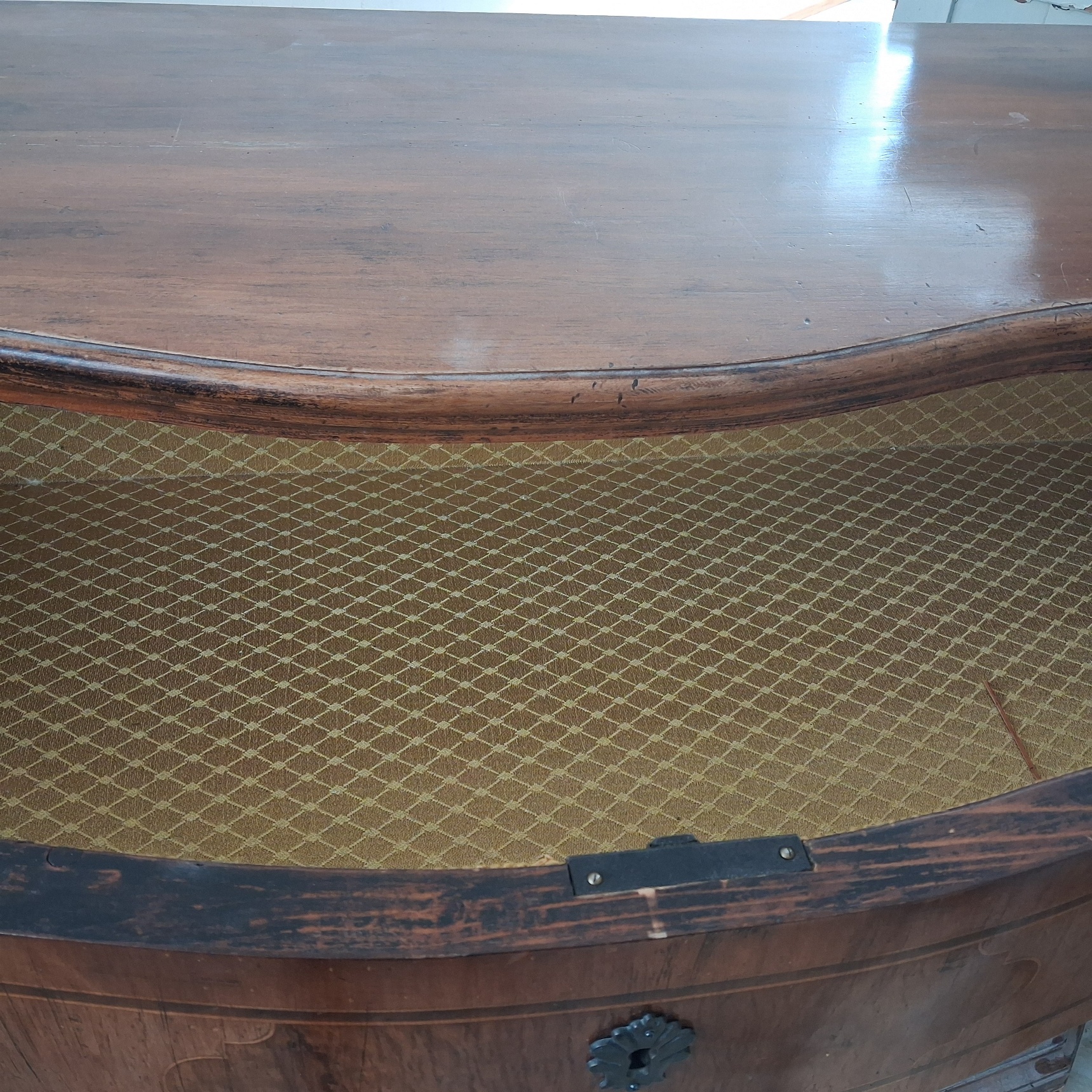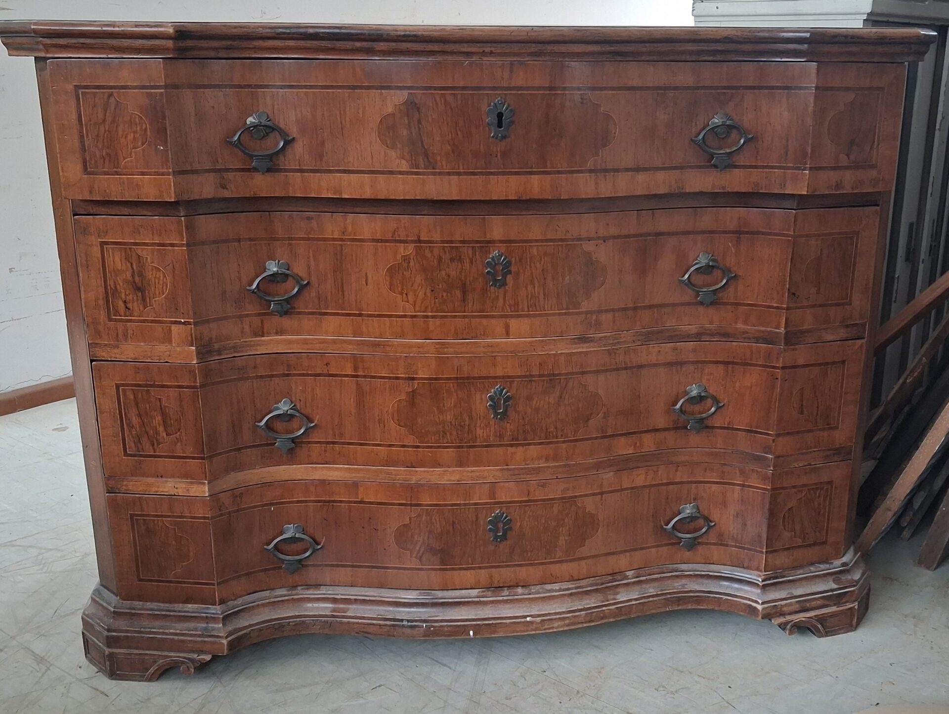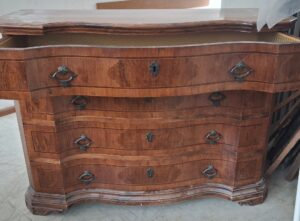 Cassettone elegante impiallacciato/lastronato in legno di noce con quattro cassetti.