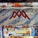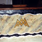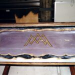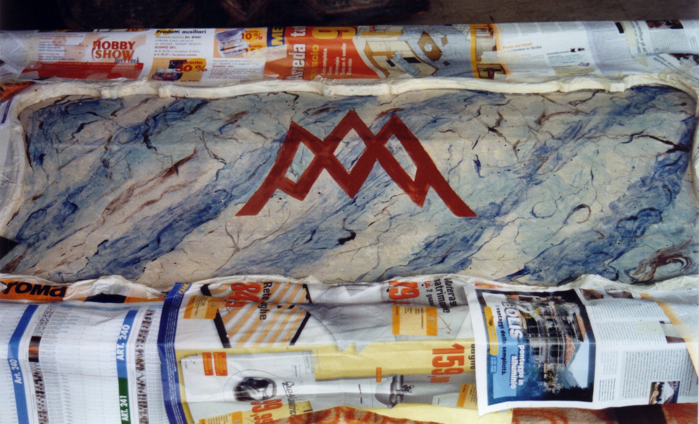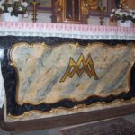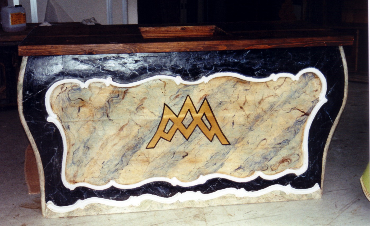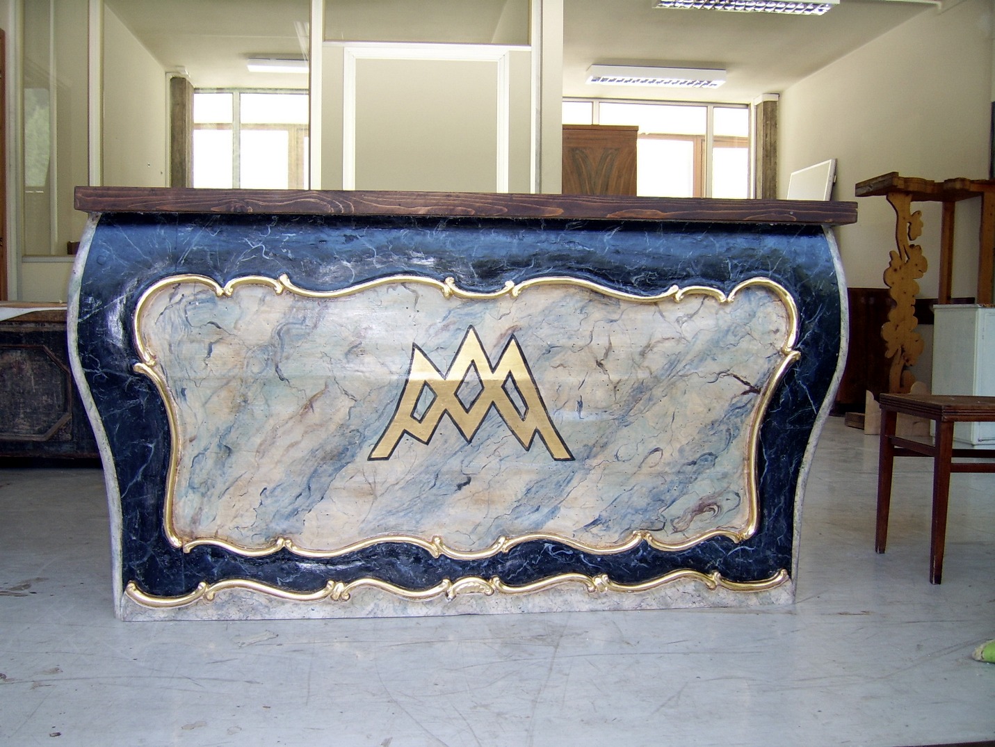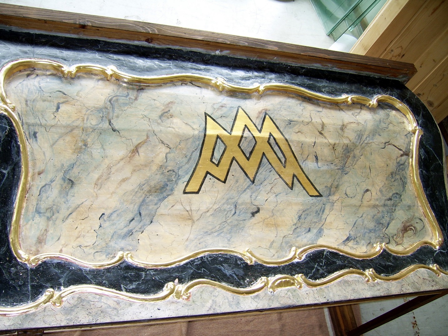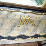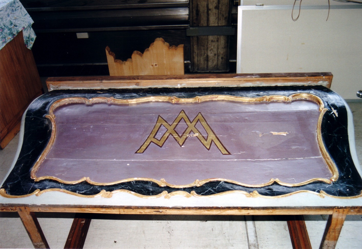 L’acrostico con il simbolo di Maria e le rocailles sono state dorate con tecnica “a guazzo” e foglia oro arancio.