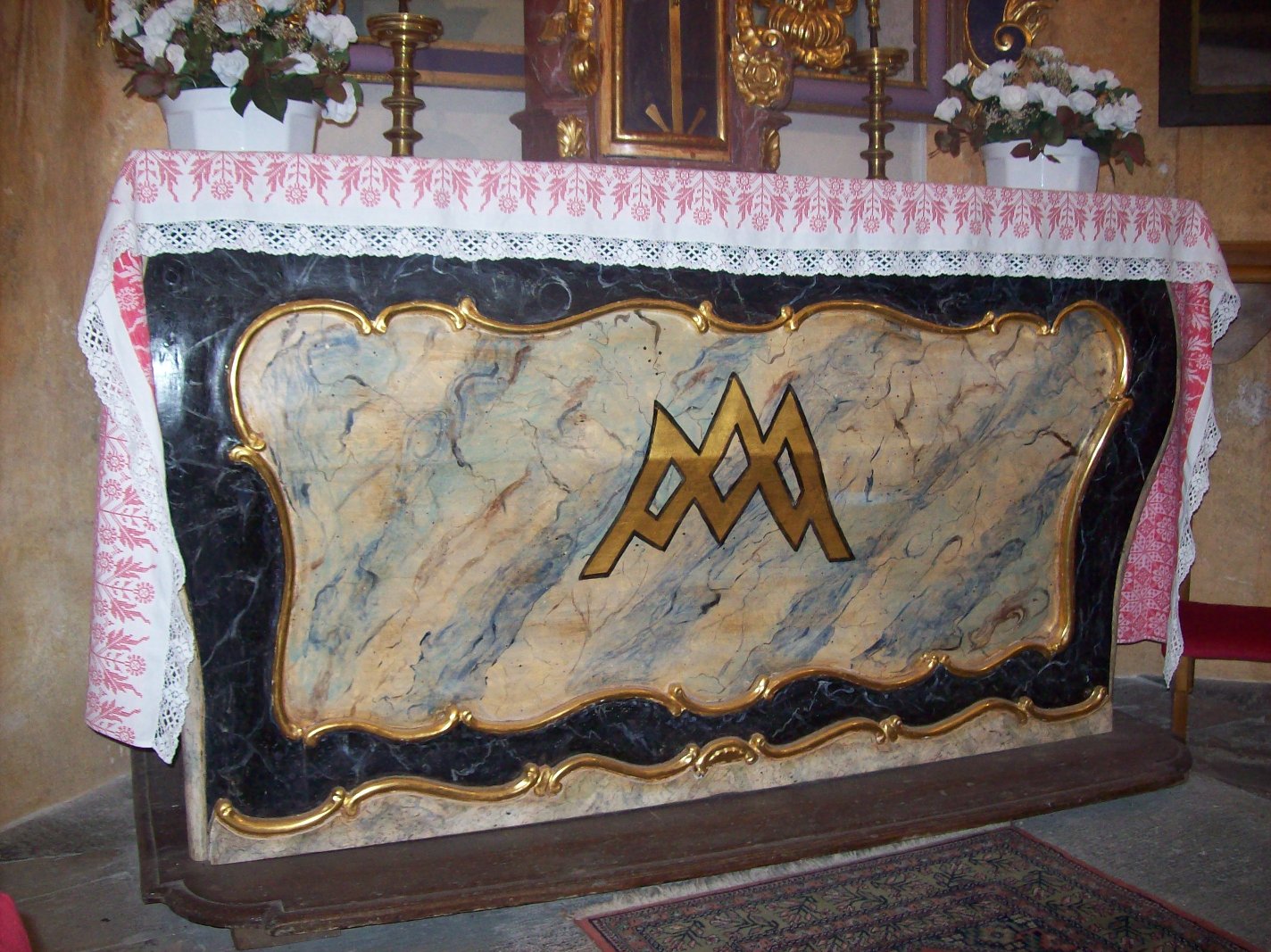 Un altare ligneo policromo di epoca barocca situato al centro dell’Abside della chiesetta dedicata
