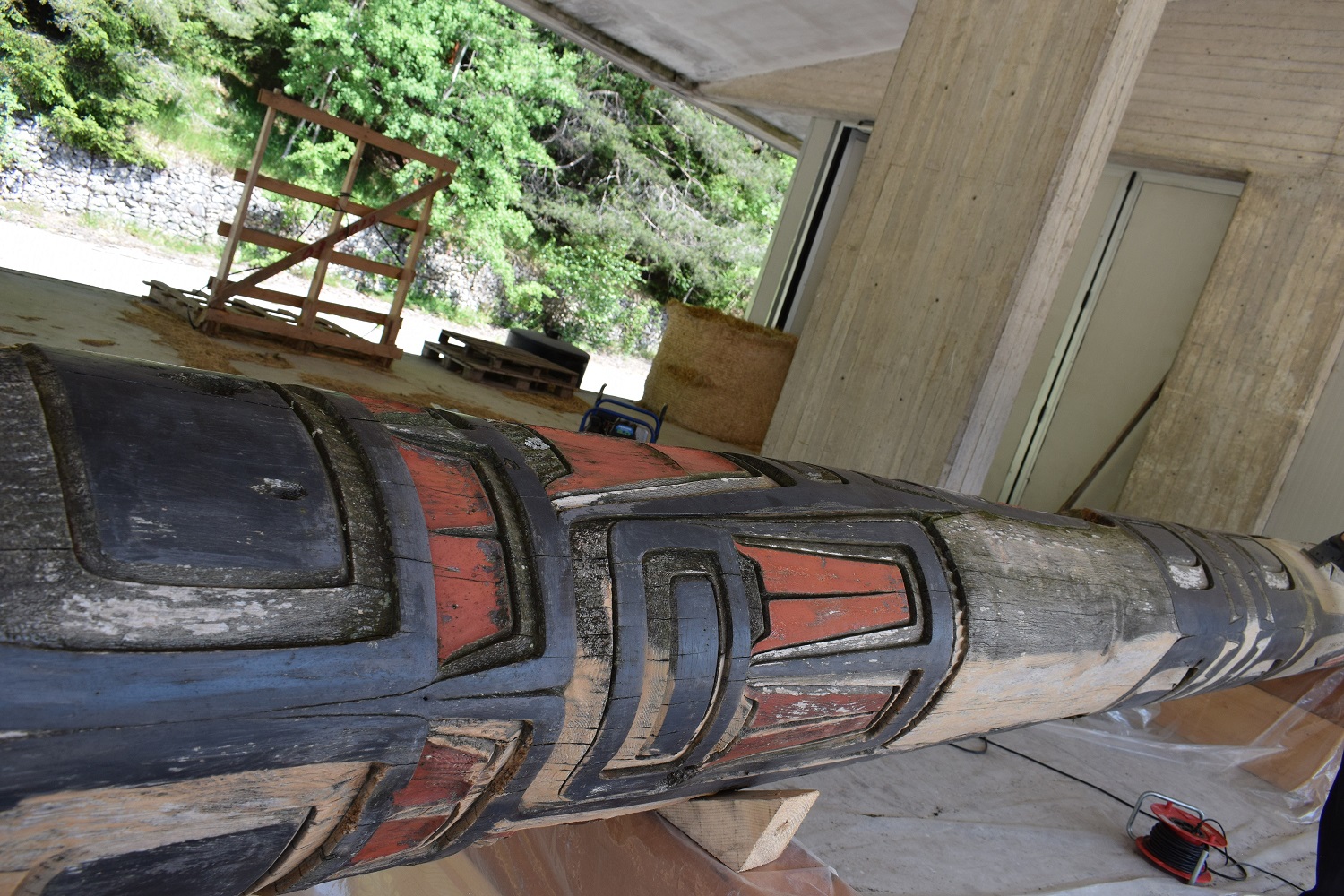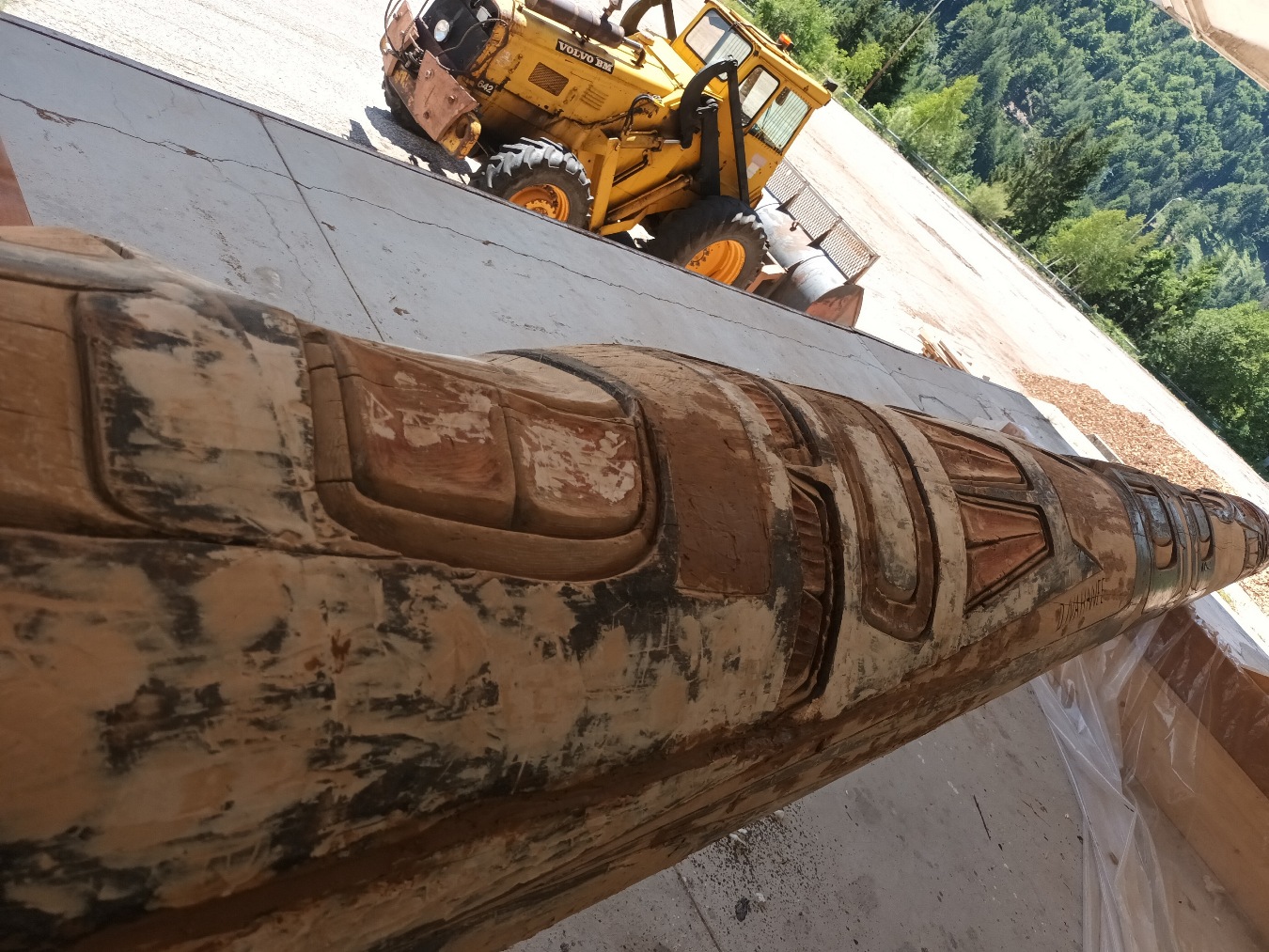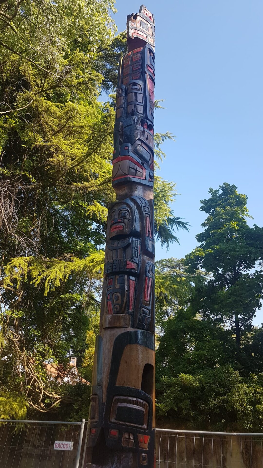 L’opera dello scultore Dave Nahanee, artista della British Columbia (Canada) è stata ricavata dal tronco di un cedro rosso canadese pluricentenario che raggiungeva i 33 metri di altezza. Scolpito e poi dipinto con i caratteristici colori rosso e blu scuro, il TOTEM, alto 727 cm fuori terra (e 110 cm interrati) racconta la storia della creazione del mondo attraverso l’uso di simboli ancestrali profondamente ancorati alla cultura dei nativi del Nord America. All’apice si riconosce l’UCCELLO DEL TUONO, Dio del Cielo, con il becco adunco da rapace che simboleggia il creato. Subito sotto l’ORSO, Dio della Terra, che annuncia la comparsa dell’umanità sulla terra e la sua presa di possesso rappresentata dal salmone stretto fra le zampe dell’orso. Infine il PESCE NERO, l’ORCA del Pacifico settentrionale, che si presenta come il Dio delle Acque.