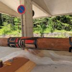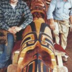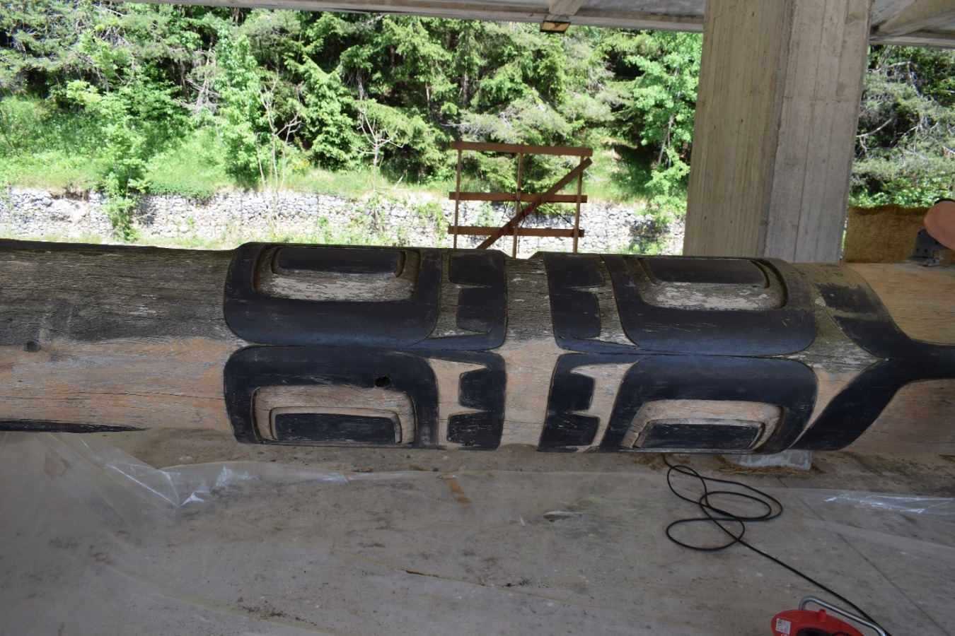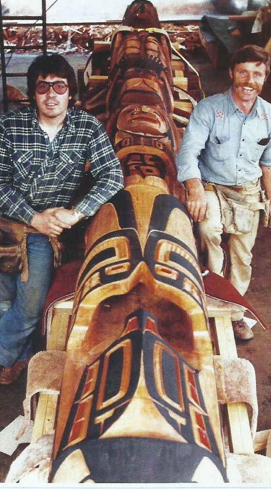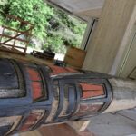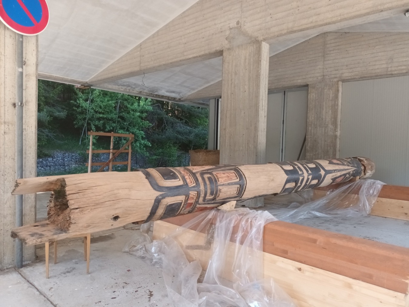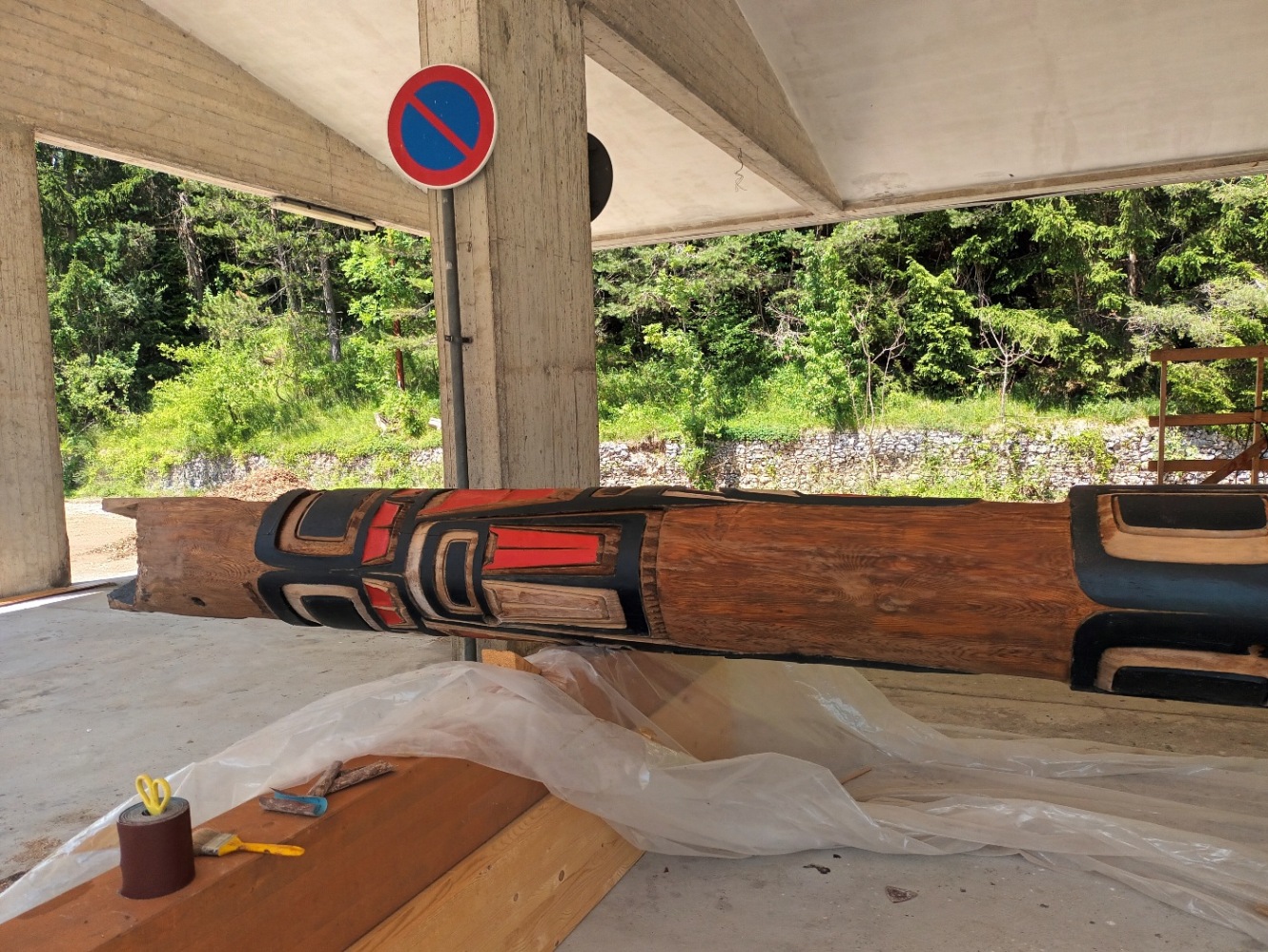 L’opera dello scultore Dave Nahanee, artista della British Columbia (Canada) è stata ricavata dal tronco di un cedro rosso canadese pluricentenario che raggiungeva i 33 metri di altezza. Scolpito e poi dipinto con i caratteristici colori rosso e blu scuro, il TOTEM, alto 727 cm fuori terra (e 110 cm interrati) racconta la storia della creazione del mondo attraverso l’uso di simboli ancestrali profondamente ancorati alla cultura dei nativi del Nord America. All’apice si riconosce l’UCCELLO DEL TUONO, Dio del Cielo, con il becco adunco da rapace che simboleggia il creato. Subito sotto l’ORSO, Dio della Terra, che annuncia la comparsa dell’umanità sulla terra e la sua presa di possesso rappresentata dal salmone stretto fra le zampe dell’orso. Infine il PESCE NERO, l’ORCA del Pacifico settentrionale, che si presenta come il Dio delle Acque.